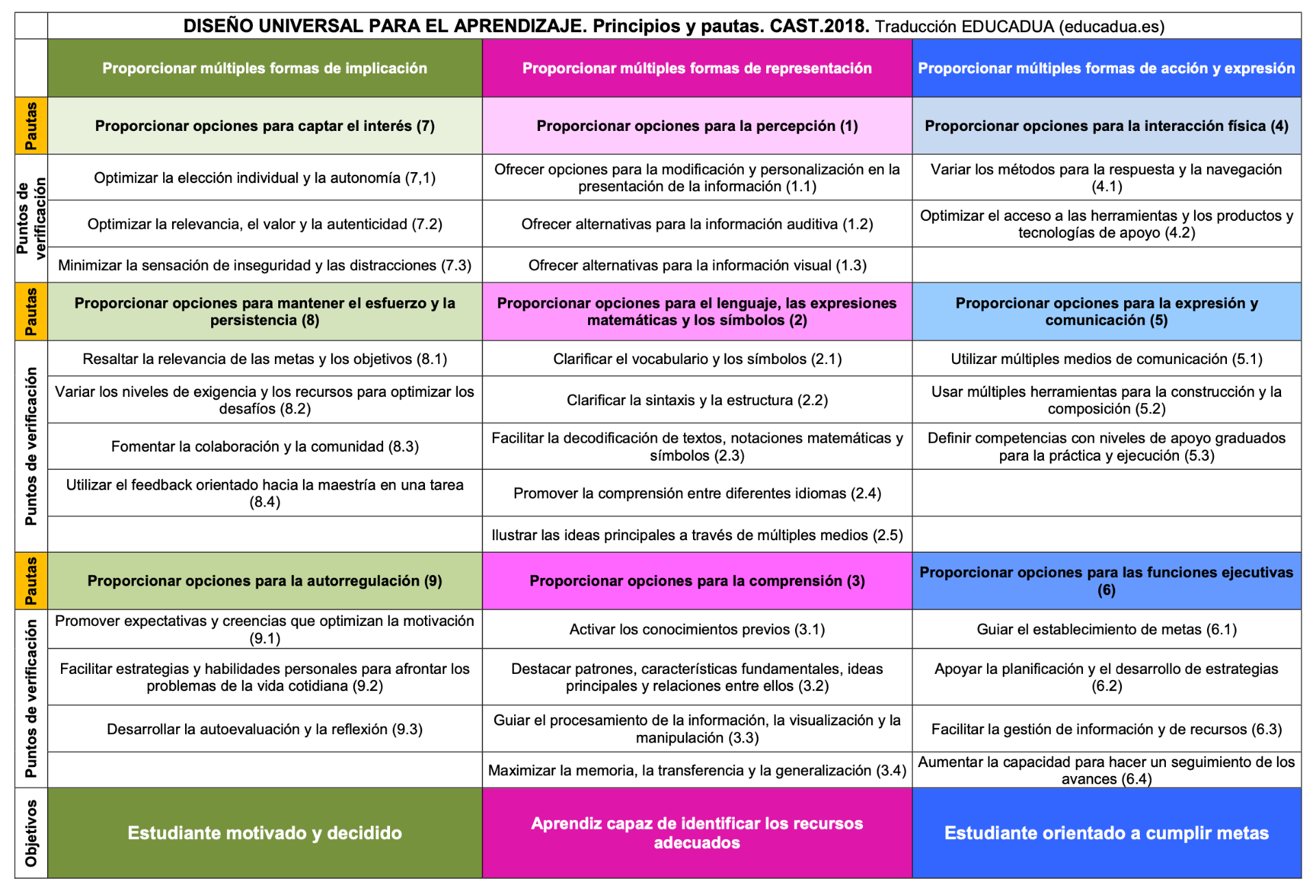 El DUA ayuda a tener en cuenta la variabilidad de los estudiantes al sugerir flexibilidad en los objetivos, métodos, materiales y evaluación que permitan a los educadores satisfacer dichas necesidades variadas. El currículum que se crea siguiendo el marco del DUA es diseñado, desde el principio, para atender las necesidades de todos los estudiantes, haciendo que los cambios posteriores, así como el coste y tiempo vinculados a los mismos sean innecesarios. (CAST, 2011, p. 3).